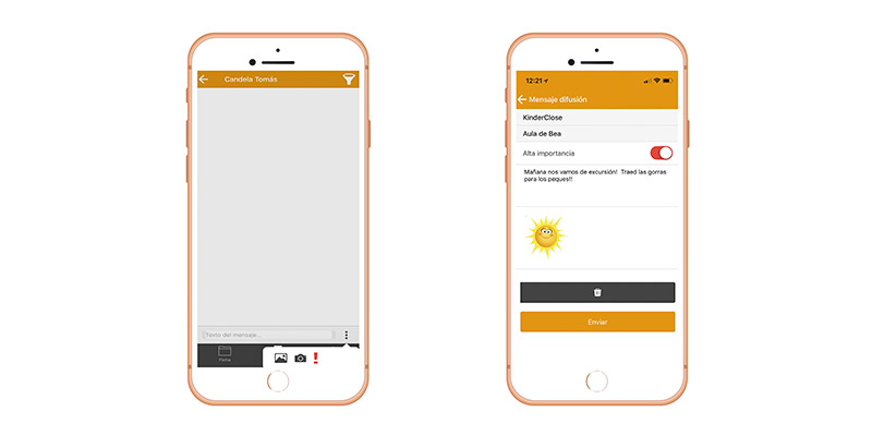 A partir de ahora, desde la App KinderClose, los profesores pueden enviar mensajes de Alta Importancia, tanto de difusión (para toda una clase o para todo el centro), como individuales a una única familia. Para ello, antes de enviar el mensaje, el profesor deberá marcarlo como mensaje de Alta Importancia pulsando en alguno de estos iconos.